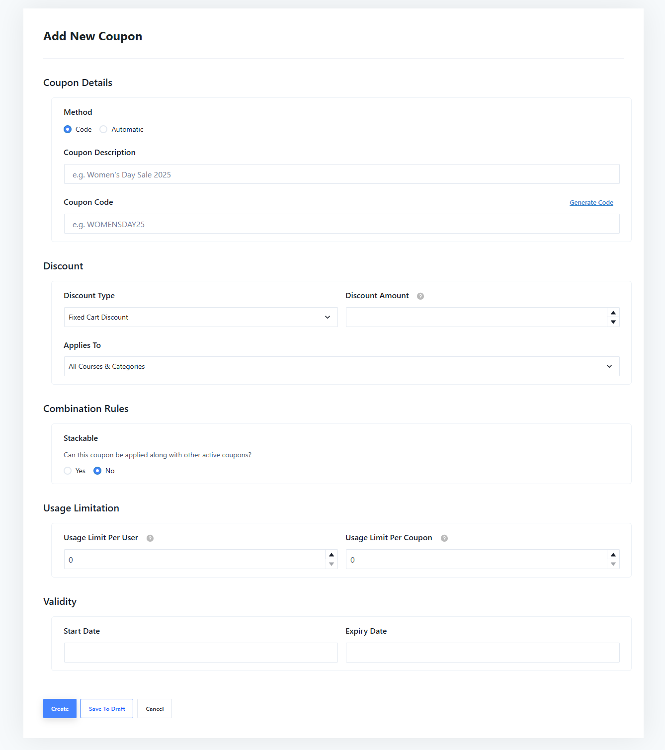 Once you have set all of the above fields, you can click on the Create button to create the coupon or click on Save to Draft to save the coupon for future use.