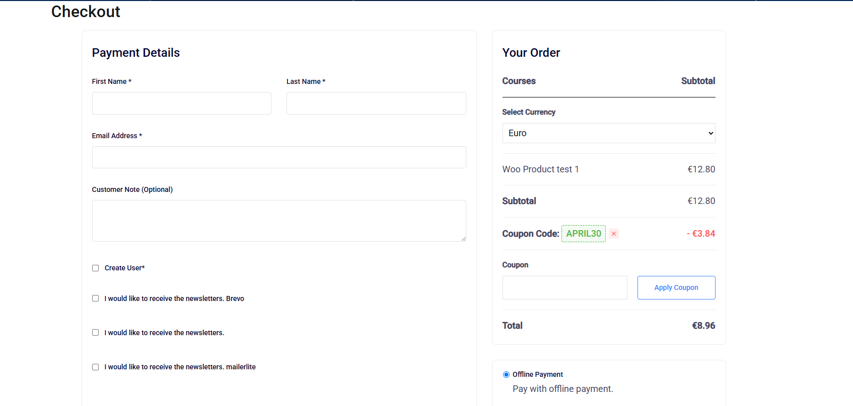 Once a user buys a course, they will be redirected to the checkout page. Here, you will find a checkout form where you will see a field called Coupon. Add the desired Coupon code and click on Apply Coupon to find the total sum after the given discount.
